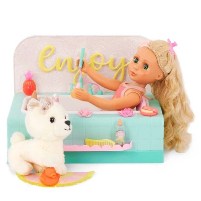 Splish, splash! Take the most relaxing baths with the Glitter Girls Bubbly Bathtime Playset for 14-inch dolls! This fun set includes a turquoise bathtub and over a dozen accessories perfect for pampering your dolls at home. Create a luxurious oasis by laying down the citrus bath rug, then lining the tub with the colorful hair mist bottle, soap bar, soap dish, and bottle of bubble bath. Don’t forget the rubber duckie! This set also features a working hair clip and ocean-themed towel, so you can get your doll ready for a nice soak in the tub. Use the glittering face mask for some spa-time fun! Each piece included in the Bubbly Bathtime set is beautifully detailed and compatible with most 14-inch dolls (dolls not included).