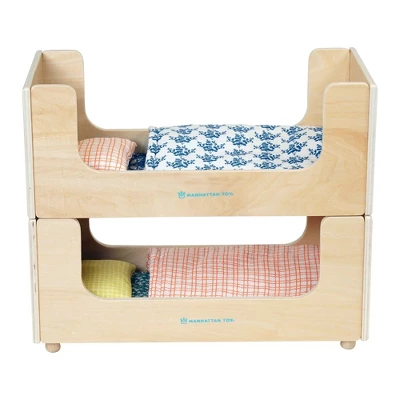 The Manhattan Toy Night Night Wooden Play Sleigh Bed for Dolls and Stuffed Animals is a delightful wooden toy bed complete with doll bedding: a green tufted thin mattress, a yellow gingham pillow, and a peachy quilted blanket. Excellent for nurturing doll play, this wooden toy pretend play accessory accommodates dolls and stuffed animals up to 15″ tall and 7″ wide. Plus, this adorable bed is stackable. Sleigh bed pairs perfectly with another Night Night bed or our Sleep Tight Sleigh Bed to create doll bunk beds, adding twice the fun! Doll play encourages nurturing skills, builds empathy, motor skills, and language development; (pictured dolls sold separately). Since 1978, Manhattan Toy has been making award-winning, high quality, educational toys for your baby, toddler or kid. From incredibly soft plush toys to baby dolls and doll accessories, our goal is to provide the safest and best toys available. All of our products, from the newest concepts to our time-tested classics, are creatively designed to inspire imaginative play..