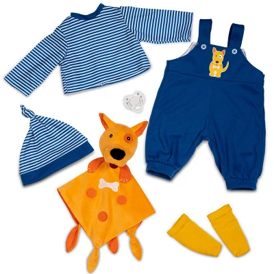 Comes with a striped long-sleeved shirt, royal blue overalls, a matching cap, bright orange socks, orange puppy lovie blanket, and a magnetic pacifier.