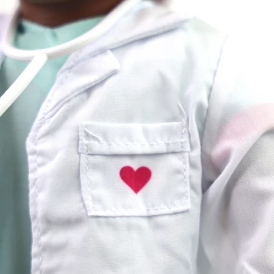 Lend a helping hand when someone asks, is there a doctor in the house! Enter the fast pace world of health care and learn what it means to help others. Show those in your care, compassion, empathy, and your amazing bedside manner with the Doctor Playtime Pack. This 11 piece set includes: A set of classic mint green scrubs, a white doctor’s lab coat embellished with a pink heart on the pocket matching shoe covers, a stethoscope, x-ray and medical chart, functioning clip-board, and mask. Also included is a color and mail post card activity allowing your child to share with someone special, the fun they’re having while playing with this adorable set from Playtime by Eimmie.